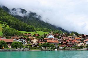 The small idyllic town of Iseltwald on the banks of Lake Brienz, Switzerland