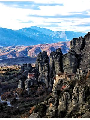 The view of the Roussanou Monastery standing tall amidst the numerous rock formations. Meteora, Greece