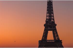 A pastel take of the Eiffel Tower, the seagull approaching towards me with the pink - orange background balances the strong subject.